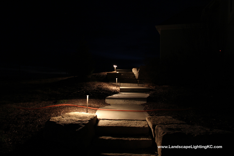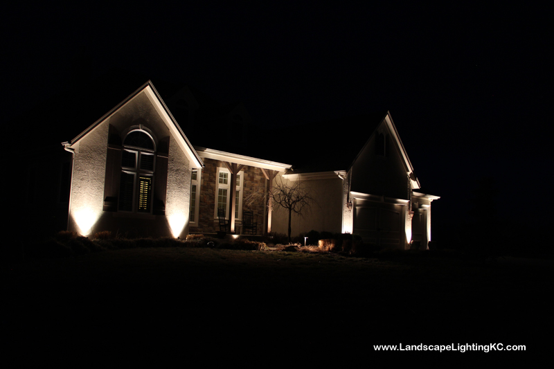 It was incredibly dark at this home in Louisburg, KS. The house sits on a lot of acreage and about 400 ft off the road. So no city lights in the way. We added landscape lights to the house so it can be seen from the road. They also help with security around the house. We also added path lights down the sidewalk to the pool area which we will light when it is complete.